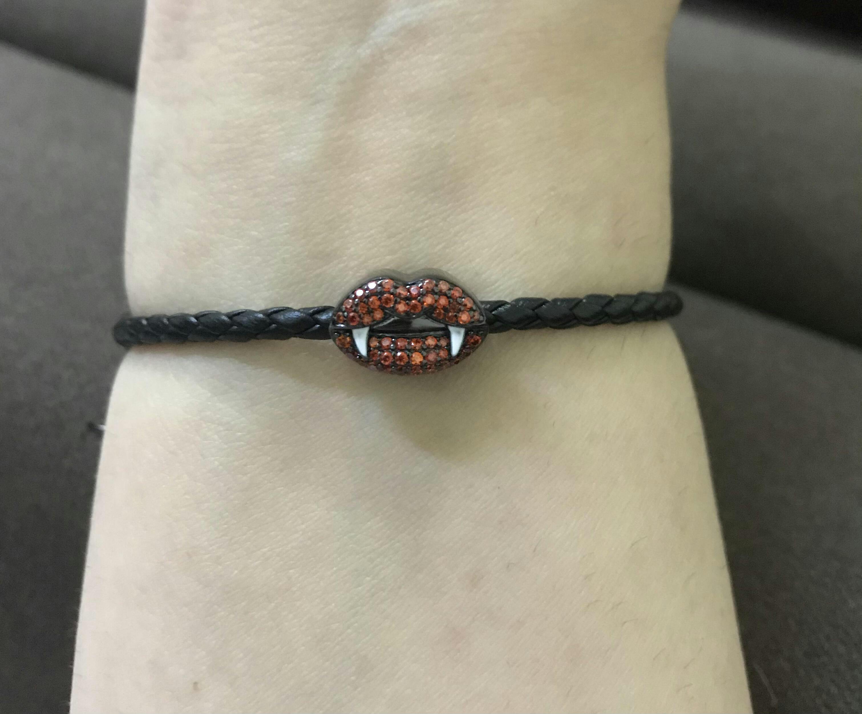 Handcrafted from 925 sterling silver with rhodium plated on the surface for the color, the red stones neatly inlaid on the devil`s mouse and two fangs sticking out. It is a good addition to your black theme bracelet.