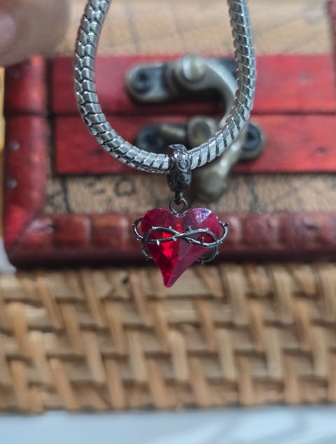 The Dark Heart of Thorns Pendant features a striking red heart that pulses with life, beautifully entwined in intricate thorns. This captivating design symbolizes the duality of love and pain, representing passion and resilience.