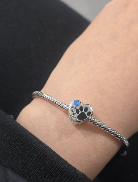 The Personalized Loving Pet Paw Photo Charm is a heartfelt tribute to your furry friend crafted from 925 sterling silver. This charm allows you to upload a cherished photo of your pet, alongside customizable options for their name and birthstone.