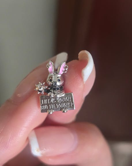 Meet the Gnoce Punk Rabbit Charm, where edgy meets adorable. This 925 silver charm features a determined bunny equipped with a spiked collar and a motivational slogan “Life is tough, but I'm a Toughter”, blending kawaii aesthetics with punk rock attitude. Perfect for lovers of alternative fashion and cute yet edgy accessories, it makes a powerful statement of resilience and style.