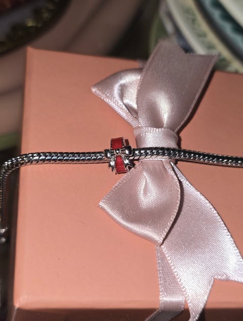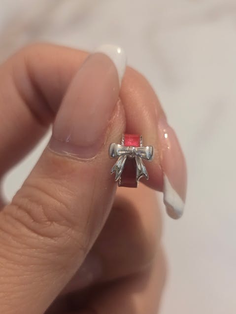 JSC180Add a festive and functional touch to your holiday bracelet with this exquisite Red Bow Stopper Charm. Meticulously handmade from 925 Sterling Silver, this charming piece features an elegant bow design in classic Christmas red. It serves as both a beautiful decoration and a practical stopper, securely holding your other charms in place with its built-in rubber ring.